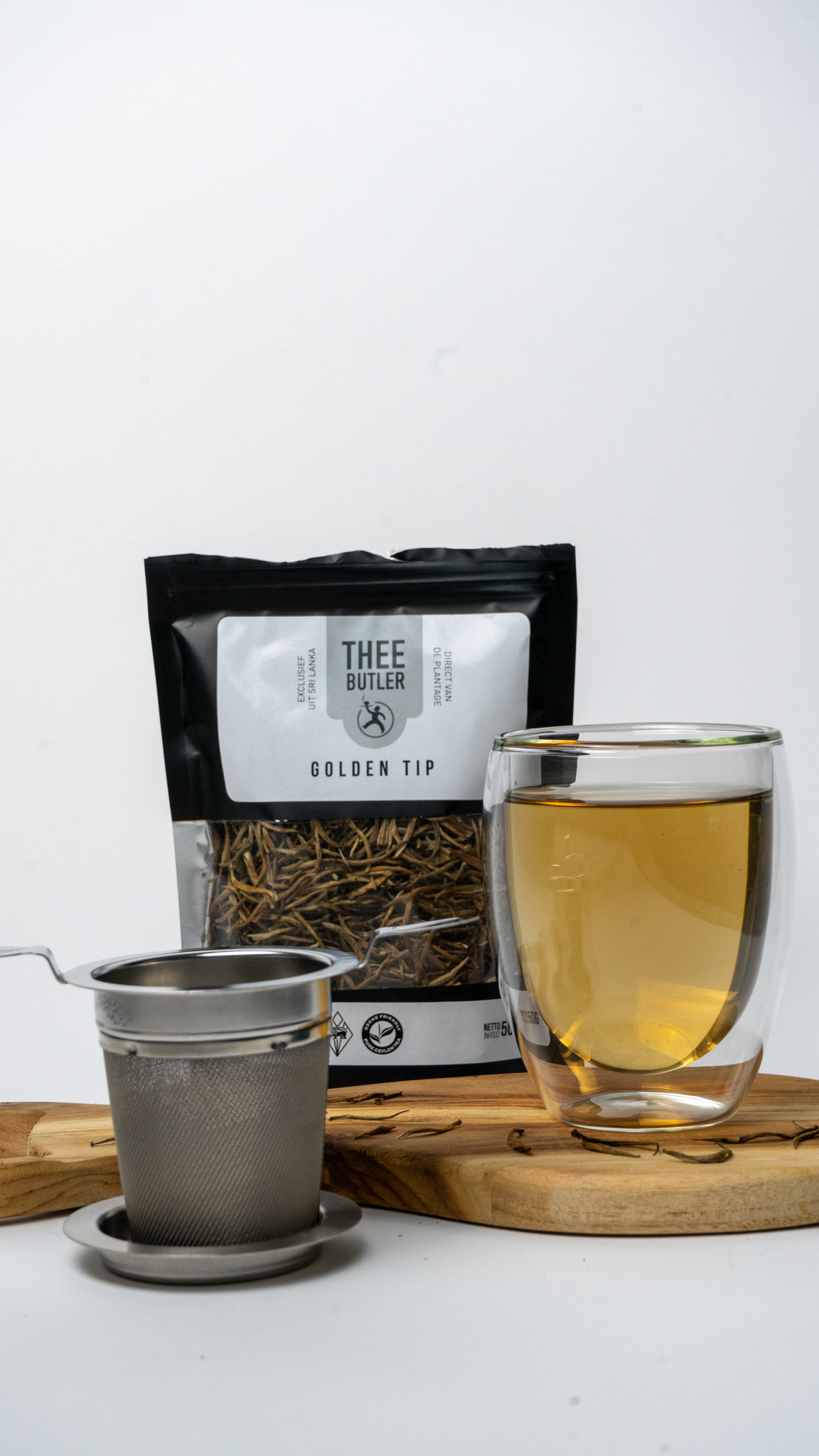 Stel je een zoete geur voor die tegelijk sprankelend en fris is. Een thee die je doet ontspannen en je tegelijkertijd energie geeft. Dat is de Golden Tip van Theebutler, gemaakt van een buitengewoon zeldzame witte thee. De Golden Tip is wat krachtiger van smaak dan de Silver Tip, maar even gezond en lekker verkwikkend. Na een kopje Golden Tip kun je er echt weer tegenaan!