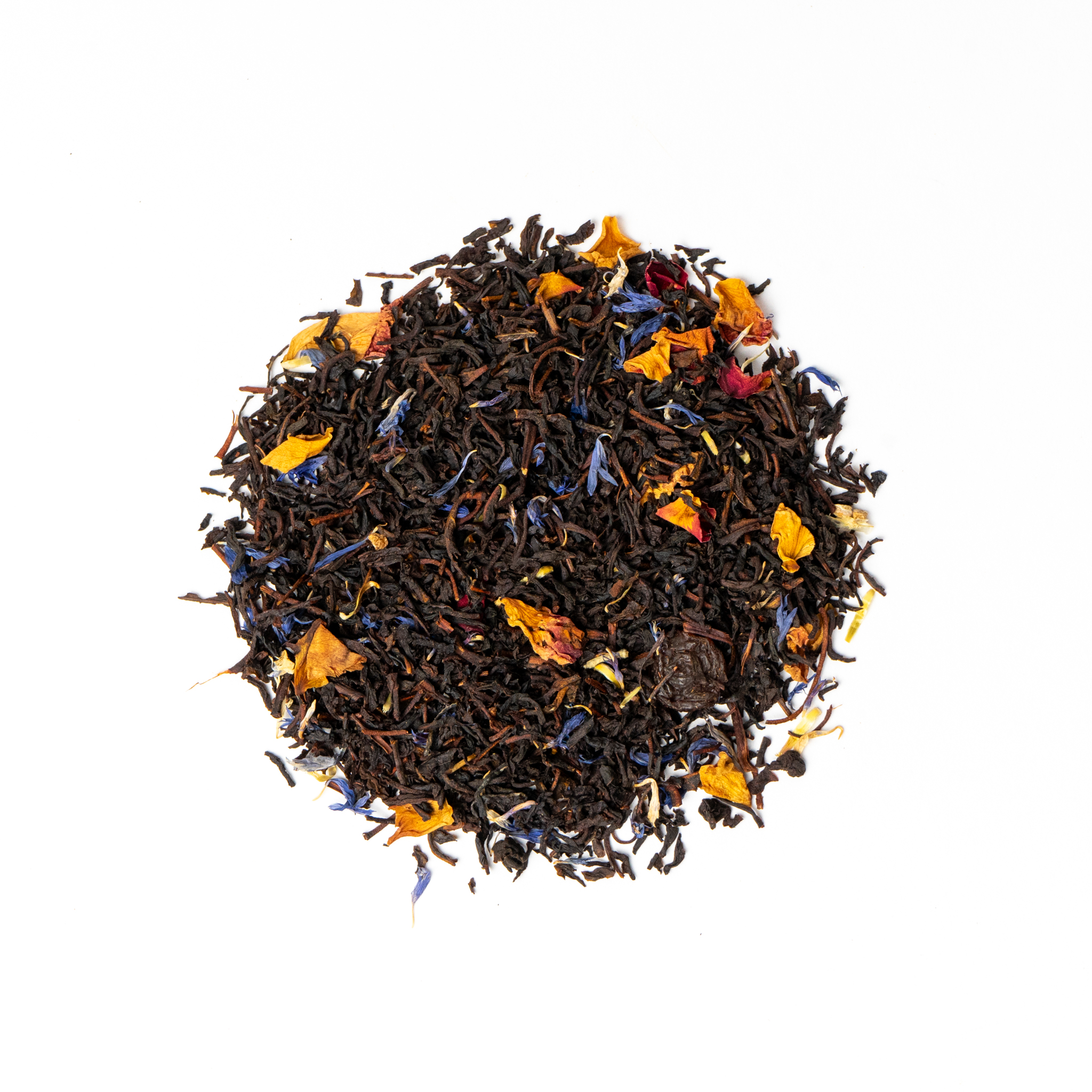 Zwarte thee (FBOP), korenbloem, rode roos blaadjes, kardemom, Pruimen, vanile aroma, amandel aroma